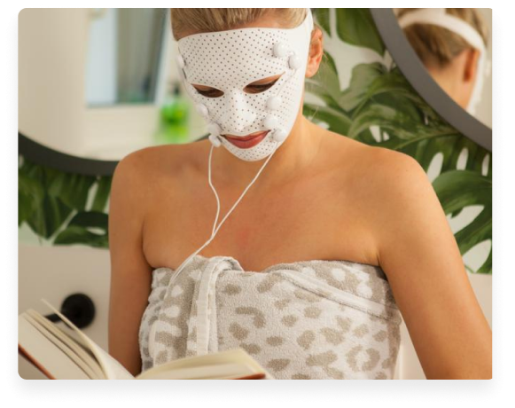 Gesichtshebung und Massage mithilfe von Mikroströmen – eine neue Generation von EMS -Geräten. Die Maske stimuliert die Meridianpunkte in drei verschiedenen Modi, um die ATP-Produktion der Haut zu fördern.